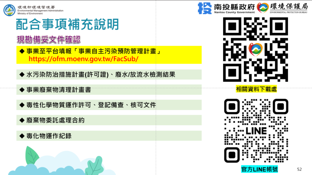 環保局呼籲:善用廠區健檢,落實風險控管,各事業單位應主動檢視廠區內可能造成污染風險的區域(如:管線、儲槽、作業區等),並定期執行自主預防作業與線上申報。企業若在預防技術或設施規劃上有相關需求,可主動聯繫經濟部產業園區管理局申請「廠區健檢」。透過專業診斷,達成「早期發現、早期處置」,落實環境風險控管,共同營造南投縣永續安全的營運環境。