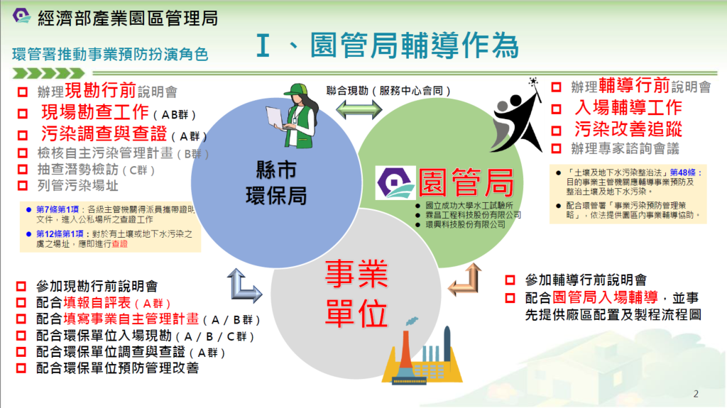 為提升縣內事業單位對土壤及地下水污染的防治意識,南投縣政府環境保護局於4月1日舉辦「事業自主污染預防管理作業說明會」。本次會議特別邀請經濟部產業園區管理局共同參與,與縣內列管事業單位面對面交流,期許透過「中央地方協作」與「企業自主管理」雙管齊下,落實廠區土壤污染預防,共創環境永續與經濟發展的雙贏局面。