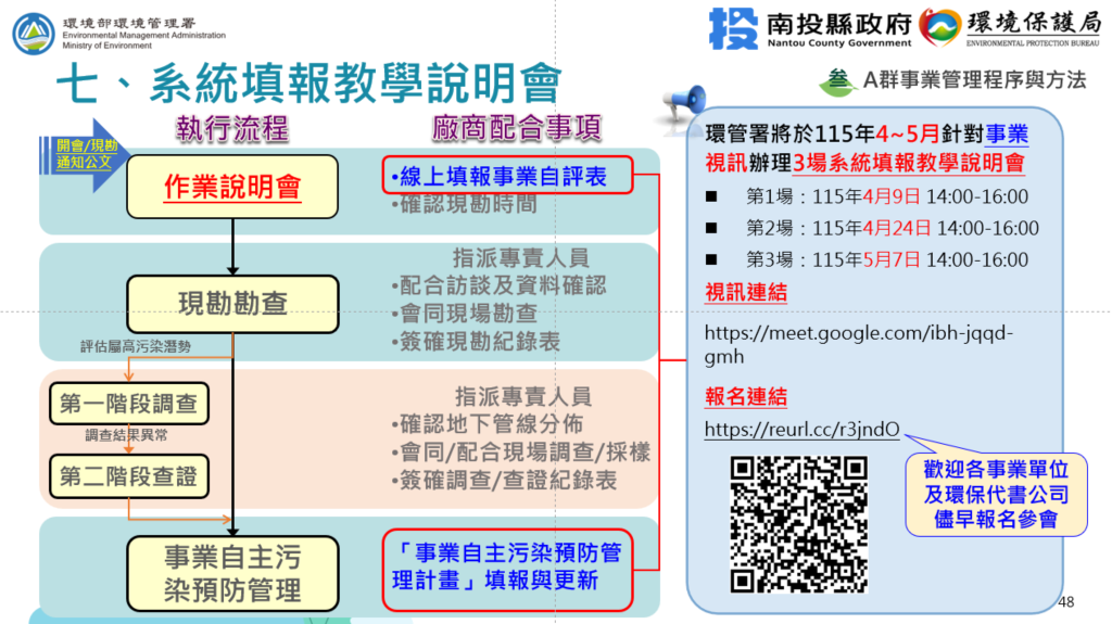 另環境部環境管理署將於115年4至5月針對事業辦理3場系統填報教學說明會(線上視訊會議),敬請各事業報名參加。
