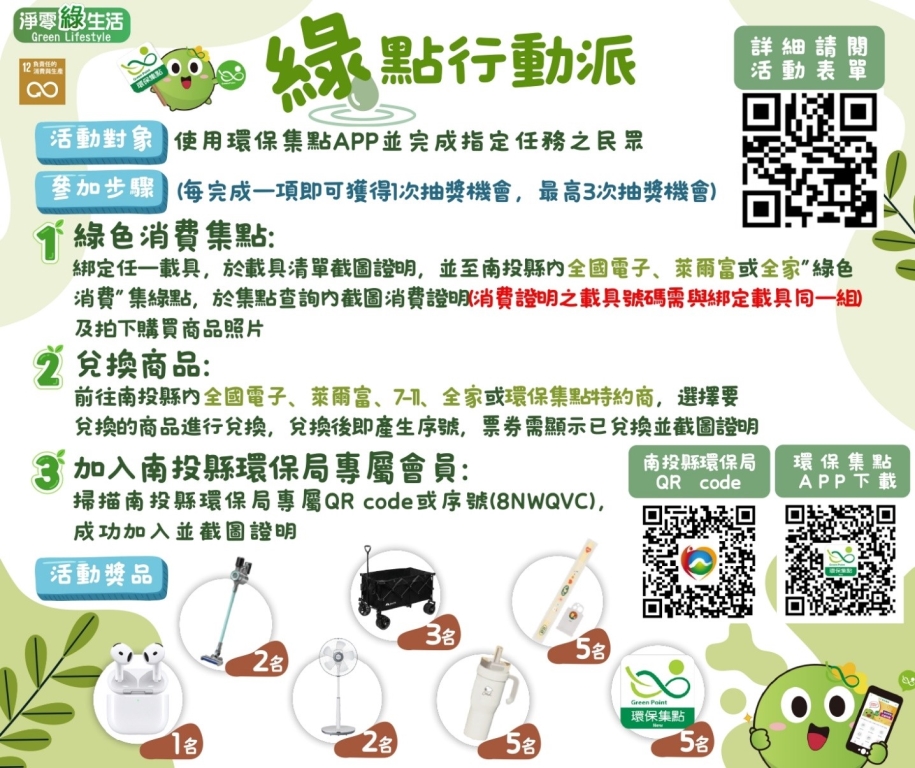 公布單位:綜合計畫科為推廣「綠色消費」理念,並引導民眾將環保行動融入日常生活,南投縣政府環境保護局結合「環保集點APP」機制,於5月1日至5月31日辦理「綠點行動派」線上抽獎活動。活動期間內,民眾只要前往指定綠色場域並完成指定任務,就有機會把精美好禮帶回家!