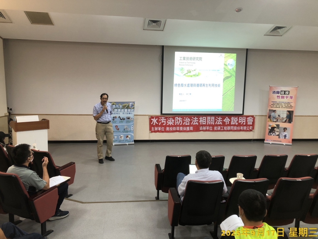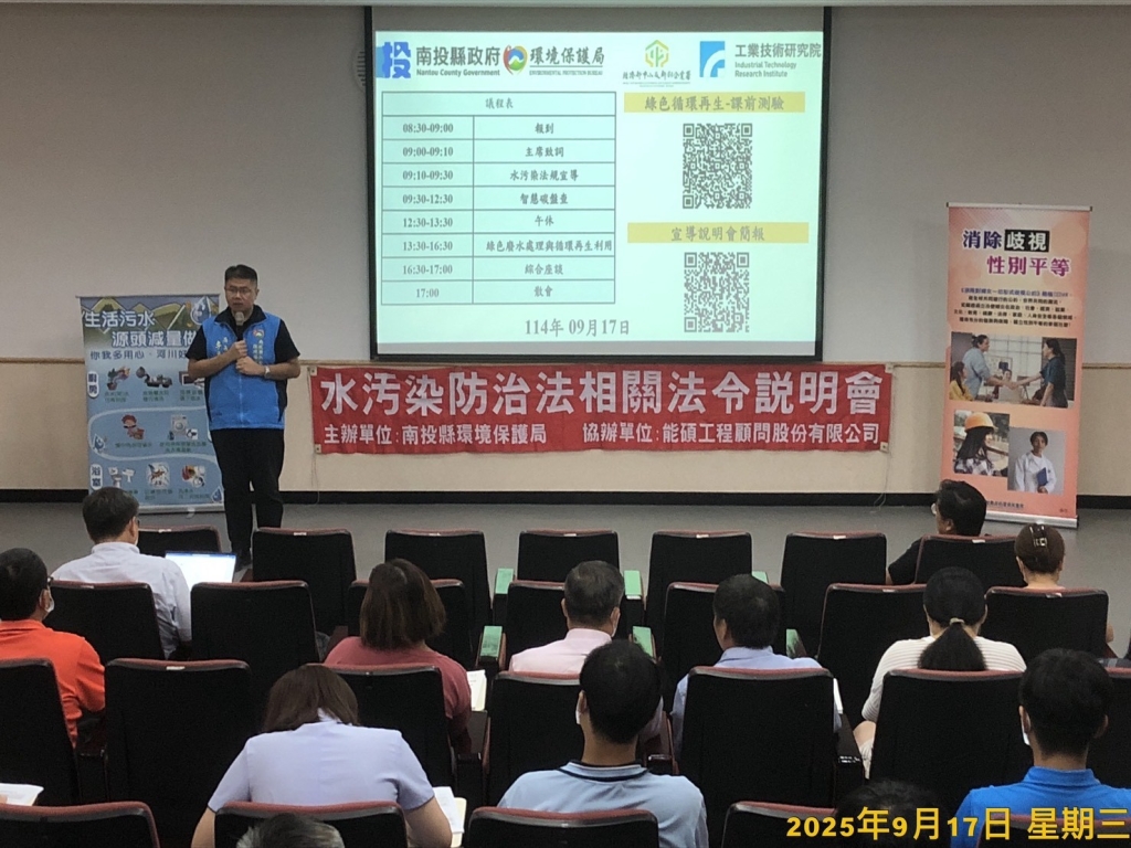 公布單位:水質保護科為協助縣內產業園區事業了解最新水污染法規修正重點及放流水標準加嚴措施,並推動產業朝向廢水資源化、能源化及低碳智慧化發展,南投縣政府環境保護局於114年9月17日辦理「114年度水污染法規暨廢水綠色轉型宣導說明會」,協助業者迎接淨零挑戰、落實循環經濟,實踐聯合國永續發展目標(SDGs)。