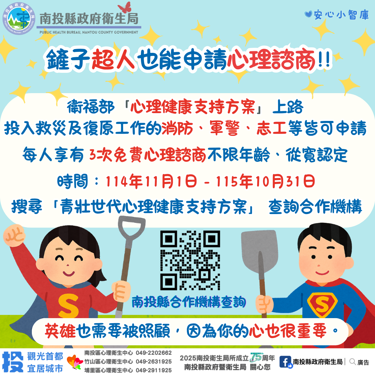 旨揭方案為因應114年9月23日花蓮縣馬太鞍溪堰塞湖溢流災害,提供救災人員及志工心理支持與專業協助,意者請洽南投縣各衛生所或心衛中心」。